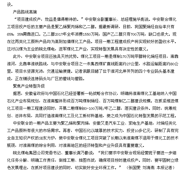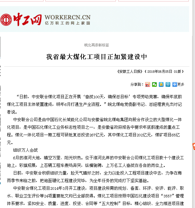 6月5日安徽工人日報頭版頭條:我省最大煤化工項目正加緊建設中